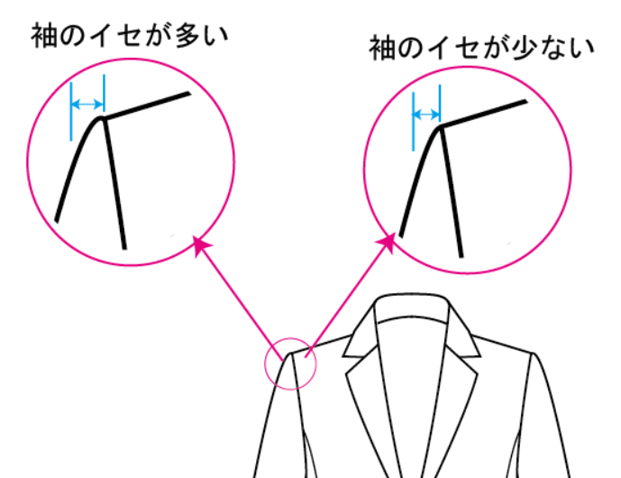 基本的に実際の体の肩から落ちる距離が長ければ長いほど、袖山が低くなるのですが、この肩の落ち具合と袖山の高さが合っていないと、ショルダーポイントに角ができます(他が原因のこともありますが)。
