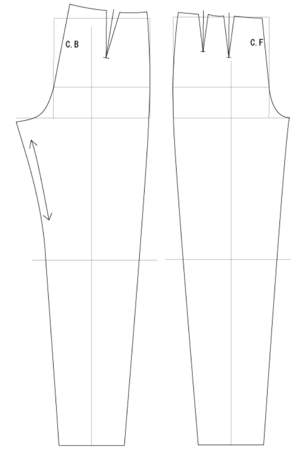 (ちなみに、上のパターンの前中心と脇、後中心と脇で寸法差を矢印で表していますが、前より後のほうが差があります。つまり、前中心線と後中心線なら、前中心線の位置が高くなります。日本人はお尻のボリュームがあまりない(お尻の位置が低い、扁平)なので、距離が短くなる、と学生の頃教わりました。スポーツなどされていて、お尻がきゅっと上がっていらっしゃる方なら、前後の差が少なくなるかもしれません。