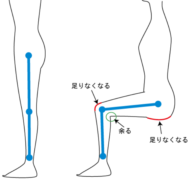 ひざは曲げるところなので、巾がせまいと動きが妨げられるのがわかりやすいですが、裾巾も小さいと座るときなんかに引っかかります。テーパードなど、ひざ巾は余裕があるけど裾が極端にせまくなっているものに多い。これは、図のように足を曲げるとタテ方向の距離が必要になってくるからです(赤線の部分)。