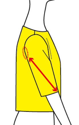 前に動かそうとすると、つっぱる感じがして動かしにくい服があります。下の図の、矢印の部分の距離が足りないから動かしにくい、と仮定します(実際は他の部分や素材、縫製などが原因のこともあるので、あくまで仮定です)。