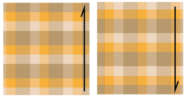 柄物(ジャカードなどの織り柄、先染めの柄、プリント物)などで、上下ひっくり返すと柄の出方が変わってしまうもの。または、毛足のある素材など