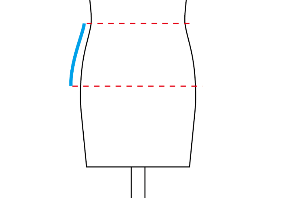 脇線はヒップ、腰のあたりが張り、ウエストとの差が大きくなります。見た目でもわかりますよね。ウエストからヒップにかけて、正面から見るとけっこうカーブがついています。そのカーブが大きい分、たての距離が必要になります。